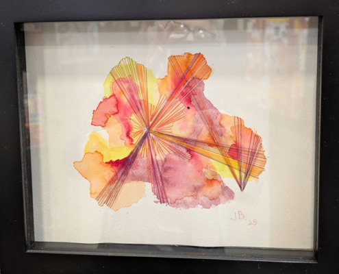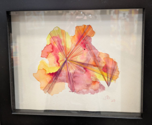 Artist Statement: In “Bursting,” I have tried to capture the sensation of watching a star burst, which is how I sometimes feel when working on a new painting. The colors of the star are bright and irregular, the arms of the star weave over and under each other, and the metallic sparkle throughout comes from a playful inner child who likes the Kaboom of an explosion. Artistic endeavors can feel like a star bursting. Ideas and images seem to come out fast from nowhere. An observer can see the mess created by the explosion but can also appreciate the process of turning the mess into a simple design.